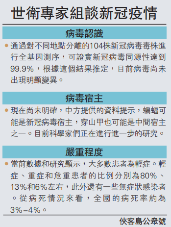 【大公报讯】在结束对中国为期9天的考察后,24日晚,中国─世界卫生组织新冠肺炎联合专家考察组在北京举行新闻发布会。世界卫生组织总干事高级顾问布鲁斯·艾尔沃德表示,在新冠肺炎的应对方面,中国是世界上掌握最多知识的国家,世界需要中国经验应对疫情。发布会最后,他动情地说,我们要认识到武汉人民所做出的贡献,世界亏欠你们!