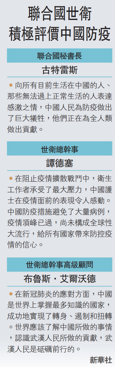 联合国秘书长古特雷斯24日与世卫组织负责人举行座谈。古特雷斯在会上表示,中国人民为尽量减轻新冠肺炎疫情造成的负面影响,实施严格的防控措施,以牺牲正常生活的方式为全人类做出了贡献。“我要向所有目前生活在中国的人、那些无法过上正常生活的人表达感激之情”。