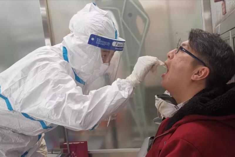 图:青岛海关关员采集有症状旅客咽拭子以送实验室检测\大公报摄