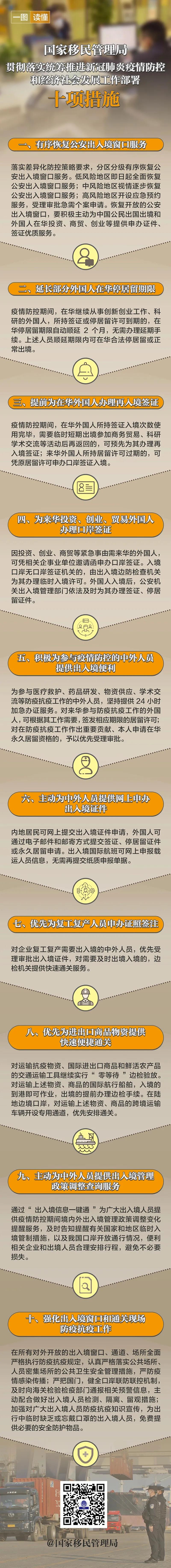 目前,国家移民管理局已向全国移民出入境管理部门作出部署,要求加强领导、严密组织,确保不折不扣落实落地、取得扎实成效。十项措施实施后,将为广大中外人员提供更加优质便捷的出入境服务,进一步增强中外人员战胜疫情的信心,便利中外人员往来,积极服务企业复工复产,促进经济社会发展。