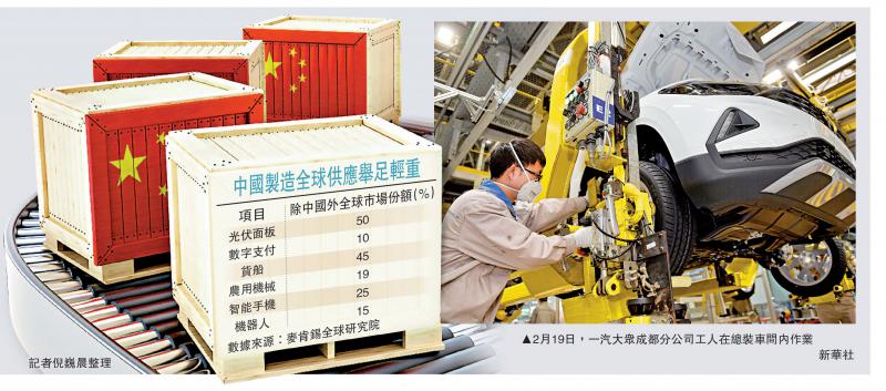 当前,中国拥有联合国产业分类的全部工业门类,在逾500种主要工业产品中,有超220种工业产品产量全球列首。面对突如其来的疫情,为维护全球供应链的稳定,中国一手抓防控疫情,一手推动各类企业安全有序地复工复产,最大限度降低疫情对全球经济的冲击。据了解,上海首次启用包机为国际汽车巨头提供零部件供应服务;正泰集团营建内地首个自动化车间加速产能。\大公报记者 倪巍晨上海报道