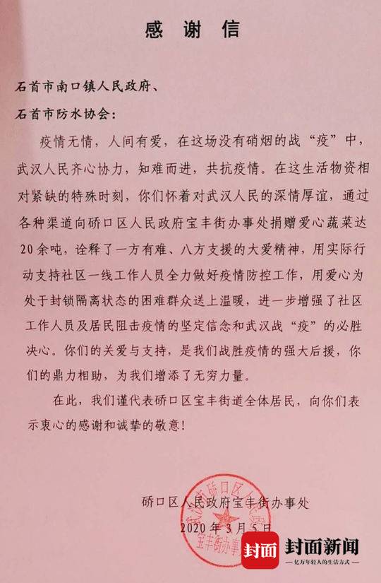 “在这生活物资相对紧缺的特殊时刻,你们怀着对武汉人民的深厚情谊,通过各种渠道向硚口区人民政府宝丰街办事处赠送爱心蔬菜达20余吨,诠释了一方有难、八方支援的大爱精神。”3月5日,武汉市硚口区宝丰街道办事处向石首市南口镇人民政府和石首市防水协会所致的感谢信,有这样一段话。