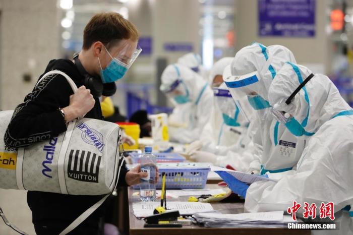3月9日,上海海关人员对入境旅客进行健康声明卡信息核查。中新社记者 殷立勤 摄