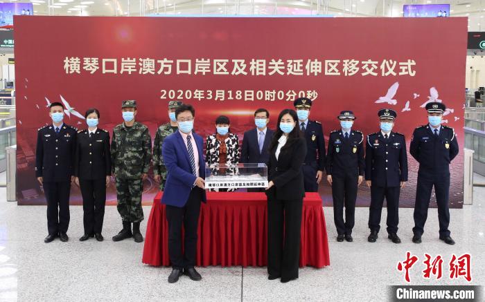 中新网珠海3月18日电 (邓媛雯 刘心宇)18日零时,粤澳两地在横琴口岸一楼出境大厅举办交接仪式,粤方代表将“横琴口岸澳方口岸区模型”交予澳方代表,标志着横琴口岸澳方口岸区及相关延伸区旅检区域正式移交给澳门特区政府,适用澳门特别行政区法律实施管辖。