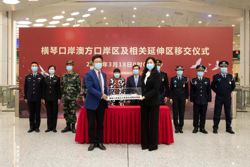 图:3月18日零时,珠澳两地在横琴口岸一楼出境大厅举行交接仪式,横琴口岸澳方口岸区及相关延伸区旅检区域正式移交给澳门特区政府,适用澳门特区法律实施管辖。图为横琴口岸澳方口岸区及相关延伸区移交仪式现场\新华社