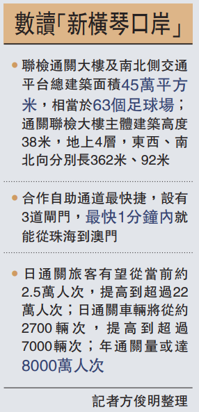 据最新设计,新横琴口岸开通后,日通关旅客有望从目前约2.5万人次,升至超22万人次;日通关车辆也将从约2700辆次增至逾7000辆次,年通关量料达8000万人次。
