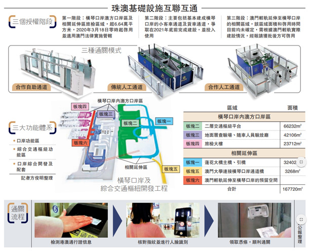 横琴口岸澳方口岸区及相关延伸区旅检区域约6.6万平方米,18日零时起正式移交给澳门特区政府,适用澳门法律管辖,也标志着粤澳基础设施互联互通又迈进一大步。据了解,横琴新口岸开通后,实施“一地两检”,实现“一次排队、一次查验、一次放行”,最快仅需一分钟就能从珠海到澳门。横琴口岸计划建小客车随车验放厅,方便乘客随车过检。\大公报记者 方俊明珠海报道