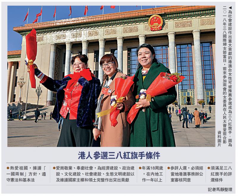 国务院港澳事务办公室日前发布消息,在内地(大陆)工作的港澳台女性可纳入三八红旗手荣誉称号评选表彰范围,参选者需具备四项基本条件。三八红旗手系由各级妇女工作组织在三月八号国际妇女节颁发给优秀劳动妇女的荣誉称号。据悉,此举旨在增强港澳台同胞的国家意识、荣誉感和参与感,推进港澳台同胞在内地(大陆)享受同等待遇、分享发展机遇,引导和激励港澳台同胞为实现中华民族伟大复兴的中国梦作出新的更大贡献。\大公报记者 马静北京报道