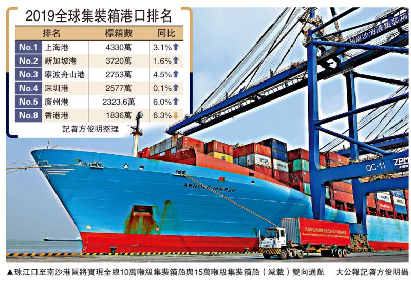 广州港深水航道拓宽工程最后8.2公里航段日前开工,标志着广州港建设国际航运枢纽的“头号工程”进入冲刺阶段。该工程投资预算近29.4亿元(人民币,下同),预计7月底竣工启用,将实现全线10万吨级集装箱船与15万吨级集装箱船(减载)双向通航。目前广州港和香港港口在中转等业务往来亦十分紧密,在目前粤港澳大湾区的政策利好背景下,双方可望进一步强化合力。据悉新冠肺炎疫情发生以来,广州港各大码头维持24小时运作,在全国港口中率先宣布延长货物进出口免费堆存期和空箱实行免费堆存。\大公报记者 方俊明广州报道