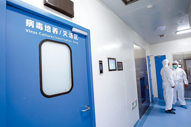图:工作人员在尚未投产的新型冠状病毒灭活疫苗生产车间的病毒培养/灭活区入口旁交流\新华社