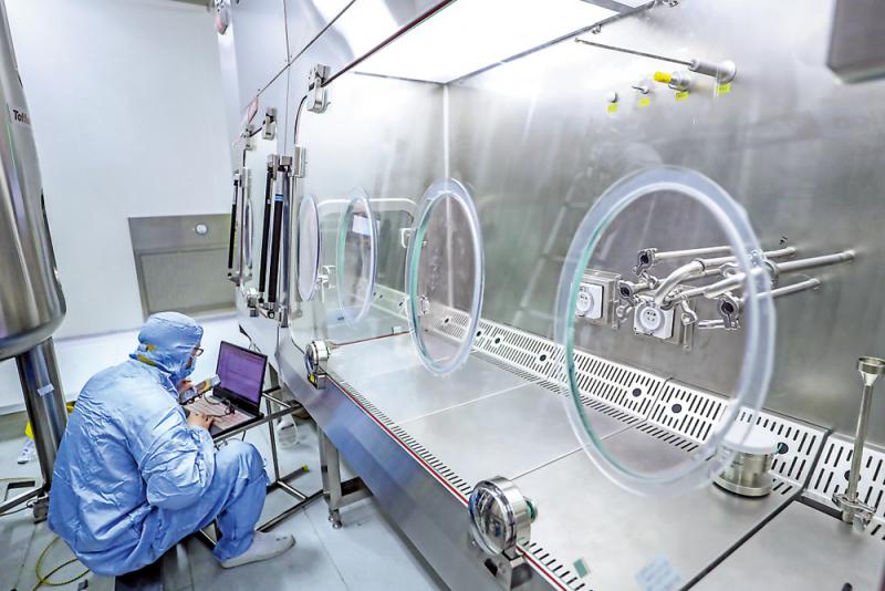 图:工作人员在国药集团中国生物新冠疫苗生产基地尚未投产的新型冠状病毒灭活疫苗生产车间内调试设备\新华社