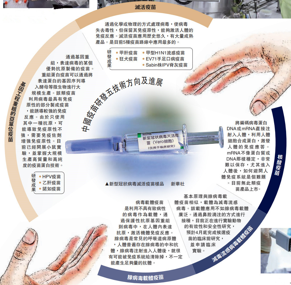 当前,中国疫苗应急攻关正按照灭活疫苗、重组蛋白疫苗、腺病毒载体疫苗、减毒流感病毒载体活疫苗、核酸疫苗5条技术路线推进。继军事科学院陈薇团队牵头研发的腺病毒载体疫苗进入II期临床之后,国药集团中国生物武汉生物制品研究所及北京科兴中维生物技术有限公司研制的灭活疫苗日前再获得国家药品监督管理局I、II期合并的临床试验许可。全球五款新冠疫苗进入临床试验,中国独占其三。