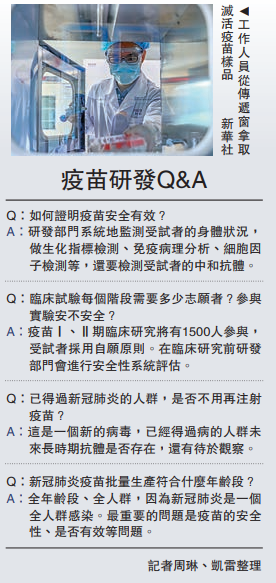 日前,中国首个新冠病毒灭活疫苗临床试验在全球率先获批启动,以往创新性疫苗研发大概需要10年左右,这次从毒株获得到疫苗研发,只用了98天就获得临床批件,这被外媒解读为“中国超速全球”。这次疫苗研发同时在多种试验动物身上开展研究,研发和申报材料提交同步进行。此外,国家启动特殊审批机制,加速推进疫苗的审评审批。疫苗研制单位相关负责人透露,根据疫情防控需要,可按照相关规定进行疫苗应急使用。\大公报记者 周琳、凯雷