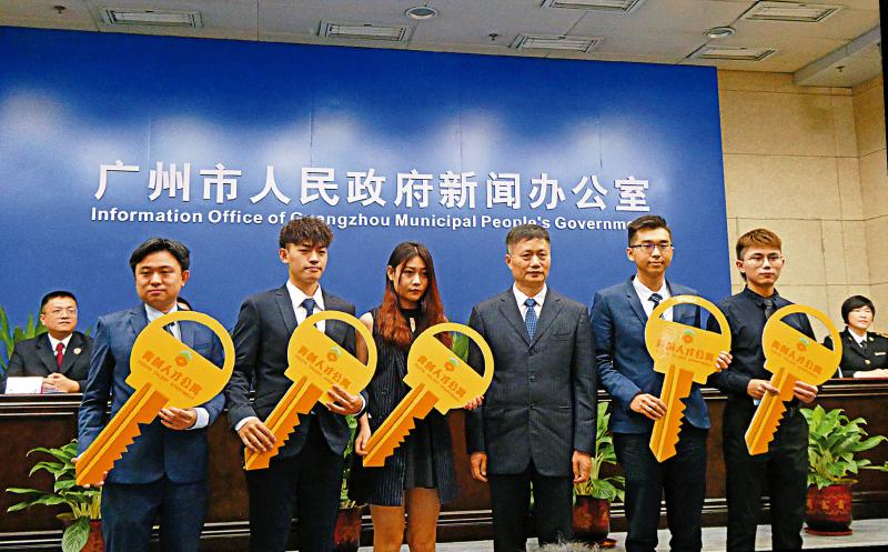 图:南沙开发区(自贸区南沙片区)管委会副主任潘玉璋为首批港澳青年洪逸曦等5人颁发南沙青创人才公寓钥匙\大公报记者黄宝仪摄