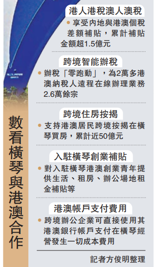 据横琴新区管委会数据,落实六大类80项鼓励类产业减按15%税率征收企业所得税,至今累计减免税额约11亿元。横琴在全国率先实行的“港人港税、澳人澳税”迄今累计补贴金额超1.5亿元,该政策也已复制推广到粤港澳大湾区内地9市。