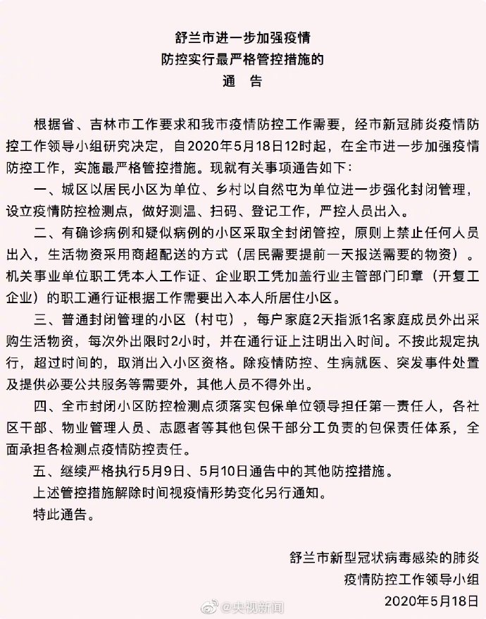 今天(18日),吉林舒兰市发布进一步加强疫情防控实行最严格管控措施的通告。自5月18日12时起,在舒兰市进一步加强疫情防控工作,实施最严格管控措施:1.城区以居民小区为单位、乡村以自然屯为单位进一步强化封闭管理,设立疫情防控检测点,做好测温、扫码、登记工作,严控人员出入。2.有确诊病例和疑似病例的小区采取全封闭管控,原则上禁止任何人员出入,生活物资采用商超配送的方式(居民需要提前一天报送需要的物资)。