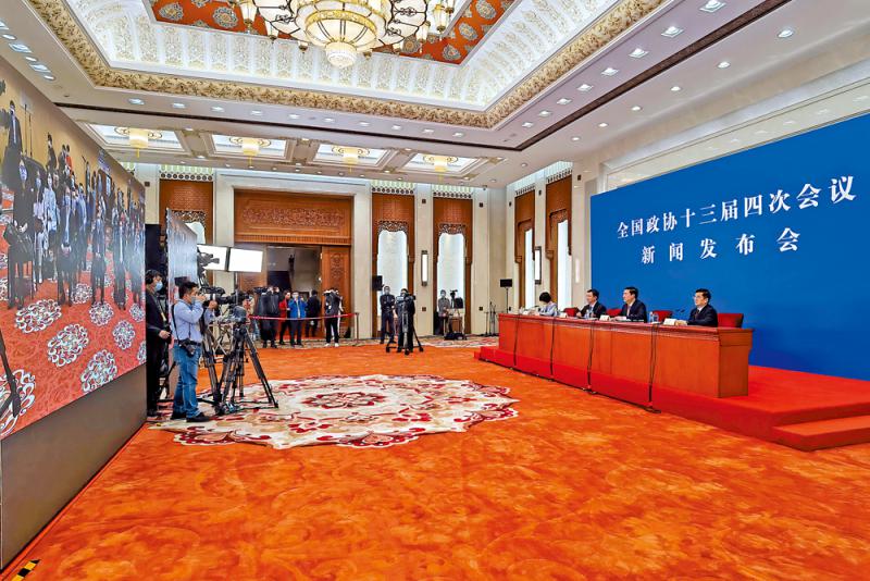 图:3月3日,全国政协十三届四次会议新闻发布会在北京举行,大会新闻发言人郭卫民向中外媒体介绍本次大会有关情况并回答记者提问。 中新社