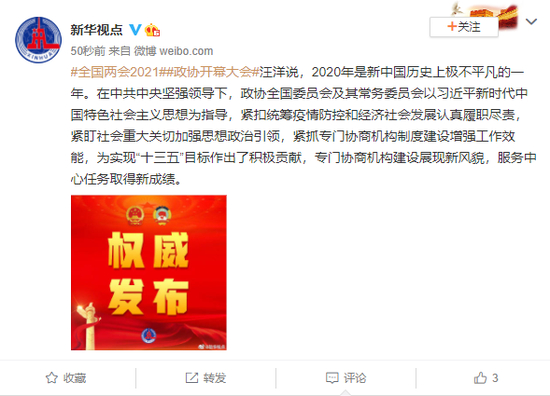 汪洋说,2020年是新中国历史上极不平凡的一年。在中共中央坚强领导下,政协全国委员会及其常务委员会以习近平新时代中国特色社会主义思想为指导,紧扣统筹疫情防控和经济社会发展认真履职尽责,紧盯社会重大关切加强思想政治引领,紧抓专门协商机构制度建设增强工作效能,为实现“十三五”目标作出了积极贡献,专门协商机构建设展现新风貌,服务中心任务取得新成绩。