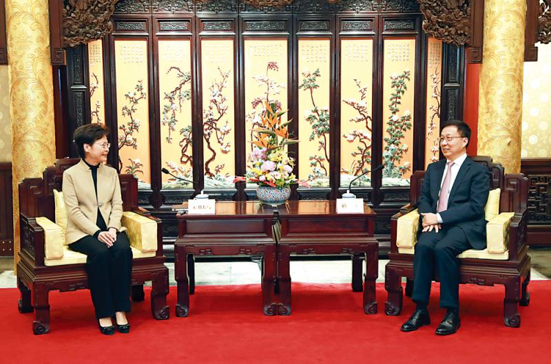 图:3月6日,中共中央政治局常委、国务院副总理韩正在北京钓鱼台国宾馆会见香港特别行政区行政长官林郑月娥。\新华社