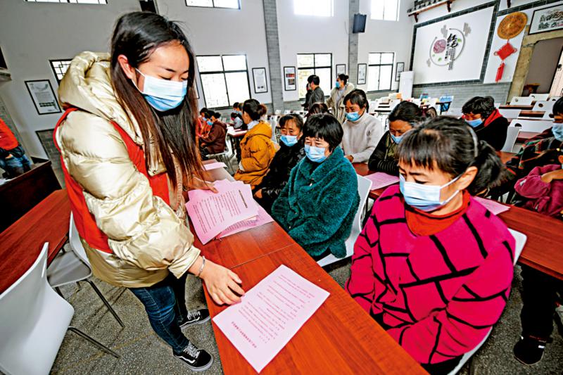 图:3月4日,在浙江杭州临安区湍口镇迎丰村,志愿者在给村民发放法律知识宣传资料。\新华社