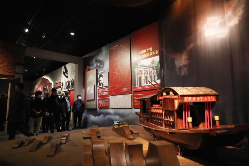本次展览还复原了嘉兴红船的模型,还原了当时的历史场面。据介绍,1921年7月23日,中国共产党第一次全国代表大会在上海召开,为躲避外国巡捕搜查,大会的最后一天转移至浙江嘉兴南湖的一隻遊船上举行。在展墙上播放的影片中,直接当事人王会悟讲述了这段经历。这次大会莊严宣告了中国共产党的诞生。