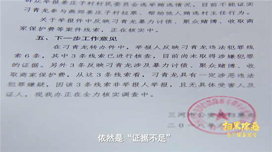 举报线索有价值却查不下去,这背后的原因究竟是什么?督导组将相关的线索列为督办线索,转交给三河市扫黑办核查。蹊跷的是,几天之后,三河市公安机关反馈的结果依然是“证据不足”。