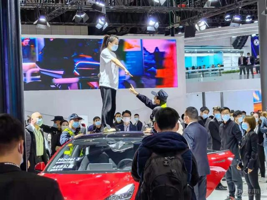 19日上午11点左右,一名女子身穿印着“刹车失灵”四个红色大字的白T恤,爬上特斯拉展车车顶高呼“特斯拉刹车失灵”,后来该女子被现场安保人员带走。20日上午,上海警方发布通报,女子张某因消费纠纷,到车展现场表达不满,造成车辆一定程度受损,张某因扰乱公共秩序被处以行政拘留五日,另一名女子李某因扰乱公共秩序被处以行政警告。随后,维权当事人之一发表微博回应:采用了错误的方式维权,但我们也绝不妥协。