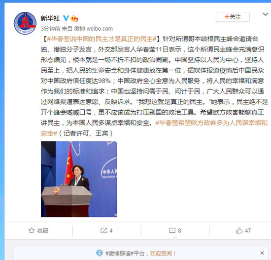 针对所谓哥本哈根民主峰会邀请台独、港独分子发言,外交部发言人华春莹11日表示,这个所谓民主峰会充满意识形态偏见,根本就是一场不折不扣的政治闹剧。中国坚持以人民为中心,坚持人民至上,把人民的生命安全和身体健康放在第一位,据媒体报道疫情后中国民众对中国政府信任度达98%;中国政府全心全意为人民服务,将人民的幸福和满意作为我们的标准和追求;中国也坚持问需于民、问计于民,广大人民群众可以通过网络渠道表达意愿、反映诉求。“我想这就是真正的民主。”她表示,民主绝不是开个峰会喊喊口号,更不应该成为打压别国的政治工具。希望欧方政客能够真正讲民主,为本国人民多谋点幸福和安全。