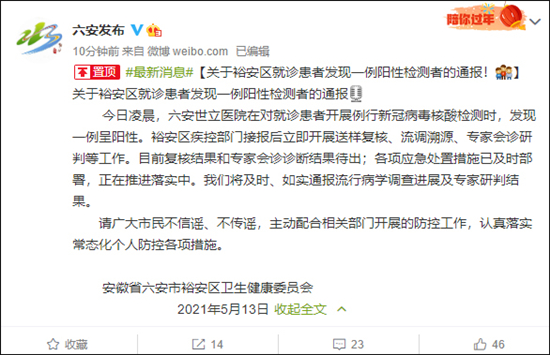 今日凌晨,六安世立医院在对就诊患者开展例行新冠病毒核酸检测时,发现一例呈阳性。裕安区疾控部门接报后立即开展送样复核、流调溯源、专家会诊研判等工作。目前复核结果和专家会诊诊断结果待出;各项应急处置措施已及时部署,正在推进落实中。我们将及时、如实通报流行病学调查进展及专家研判结果。