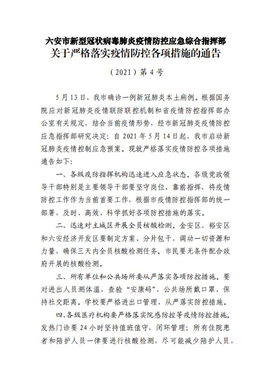 记者从安徽省六安市新型冠状病毒肺炎疫情防控应急综合指挥部获悉,根据国务院应对新冠肺炎疫情联防联控机制和省疫情防控指挥部办公室有关规定,结合当前疫情形势,经市新冠肺炎疫情防控应急指挥部研究决定,自2021年5月14日起,六安市启动新冠肺炎疫情控制应急预案。