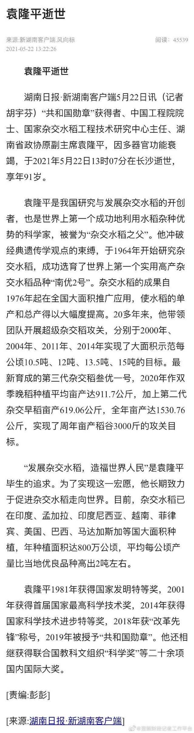 记者从中南大学湘雅医院获悉,“杂交水稻之父”、中国工程院院士、“共和国勋章”获得者袁隆平,5月22日13点07分在湖南长沙逝世,享年91岁。袁隆平是我国研究与发展杂交水稻的开创者,也是世界上第一个成功利用水稻杂种优势的科学家,被誉为“杂交水稻之父”。直到今年年初,他还坚持在海南三亚南繁基地开展科研工作。
