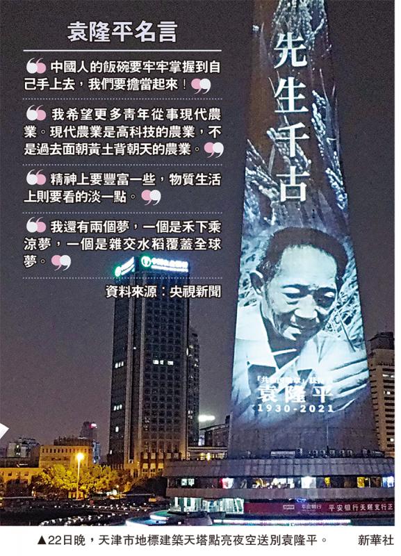据中新社报道:22日,解决了十几亿中国人吃饭问题的袁隆平院士逝世。他奋斗一生守护“大国粮仓”、保障国家粮食安全的精神永存世间。