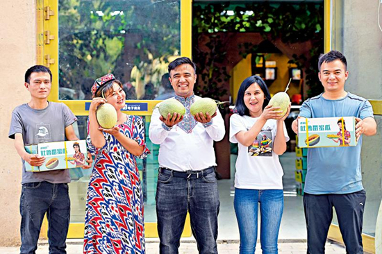 图:5月20日,新疆吐鲁番市土一家电商企业门前,公司创业团队展示其销售的哈密瓜。\新华社