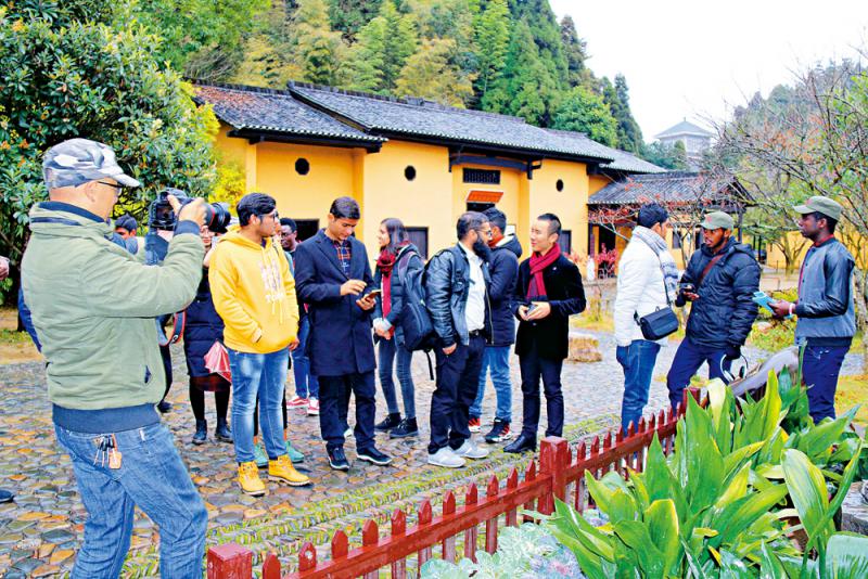 图:毛浩夫(右四)在向外宾讲述井冈山的故事。\大公报摄