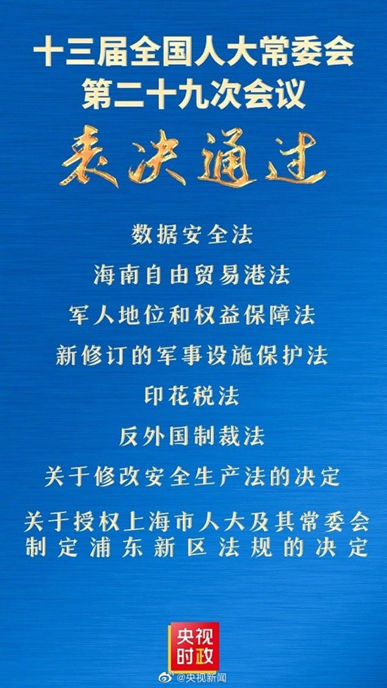 通过的法案有:《数据安全法》、《海南自由贸易港法》、《军人地位和权益保障法》、新修订的《军事设施保护法》、《印花税法》、《反外国制裁法》。