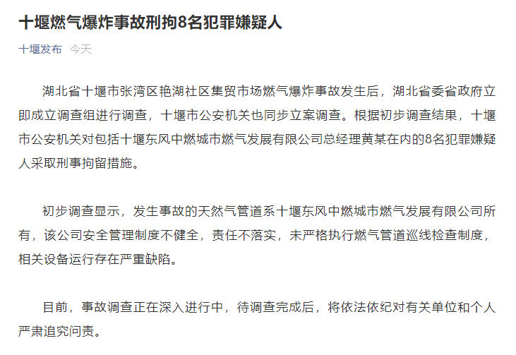 初步调查显示,发生事故的天然气管道系十堰东风中燃城市燃气发展有限公司所有,该公司安全管理制度不健全,责任不落实,未严格执行燃气管道巡线检查制度,相关设备运行存在严重缺陷。