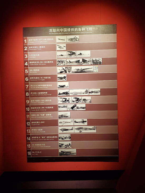 记者在纪念馆看到,一张张图片资料向参观者展示抗战时期,苏联从军事技术人员到飞机、高炮、坦克等军火物资的援华情况。展览图文资料显示,1937年10月,从苏联阿拉木图经兰州到汉口的航线开通,10月下旬第一批苏联志愿航空队先后到华。苏联先后有约5000人来华,其中包括近千名航空志愿人员;在物资方面,以飞机为例,武汉会战后,中国空军的飞机仅剩余30余架,为此,苏联先后运送了飞机近千架。