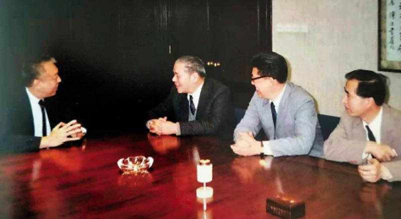 图:一九八七年,卢绪章(左二)与宁波市政府领导一起拜访董建华(左一)。/受访者供图