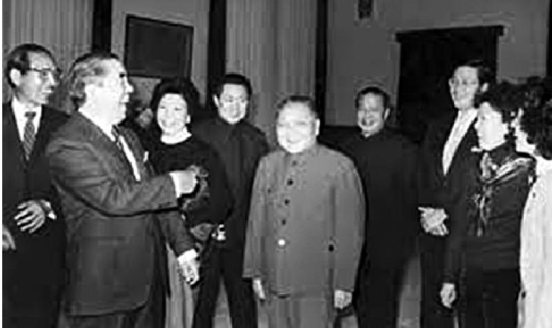 图:邓小平在人民大会堂会见由卢绪章(右四)陪同的包玉刚家人。/资料图片