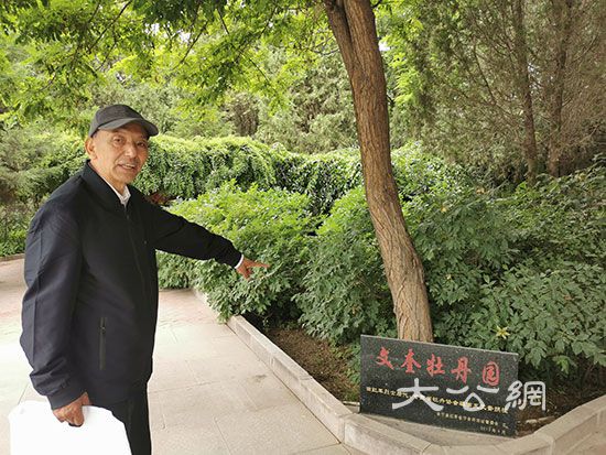 在会宁会师旧址,王文汉向记者介绍哥哥王文奎捐植的牡丹园。/记者 李晓蓉 摄