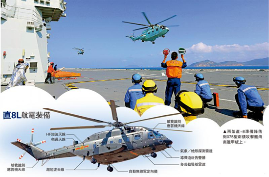 随着直-8L的服役,海军有了更多选择余地,特别是075型两栖攻击舰可搭载直-8L,与直-20搭档,分工武器装备和人员运输。在登陆作战中,直-8L可以直接在机腹装运“山猫”,快速地将作战编组单位投送至作战区域,深入海岸腹地展开攻击,强化夺岛登陆作战的效率。