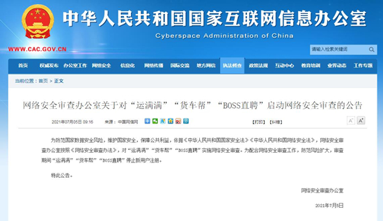 据国家网信办网站5日消息,为防范国家数据安全风险,维护国家安全,保障公共利益,依据《中华人民共和国国家安全法》《中华人民共和国网络安全法》,网络安全审查办公室按照《网络安全审查办法》,对“运满满”“货车帮”“BOSS直聘”实施网络安全审查。为配合网络安全审查工作,防范风险扩大,审查期间“运满满”“货车帮”“BOSS直聘”停止新用户注册。