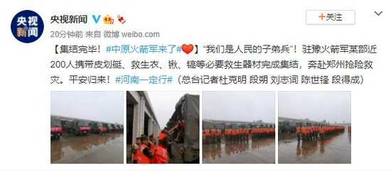 “我们是人民的子弟兵”!驻豫火箭军某部近200人携带皮划艇、救生衣、锹、镐等必要救生器材完成集结,奔赴郑州抢险救灾。平安归来!