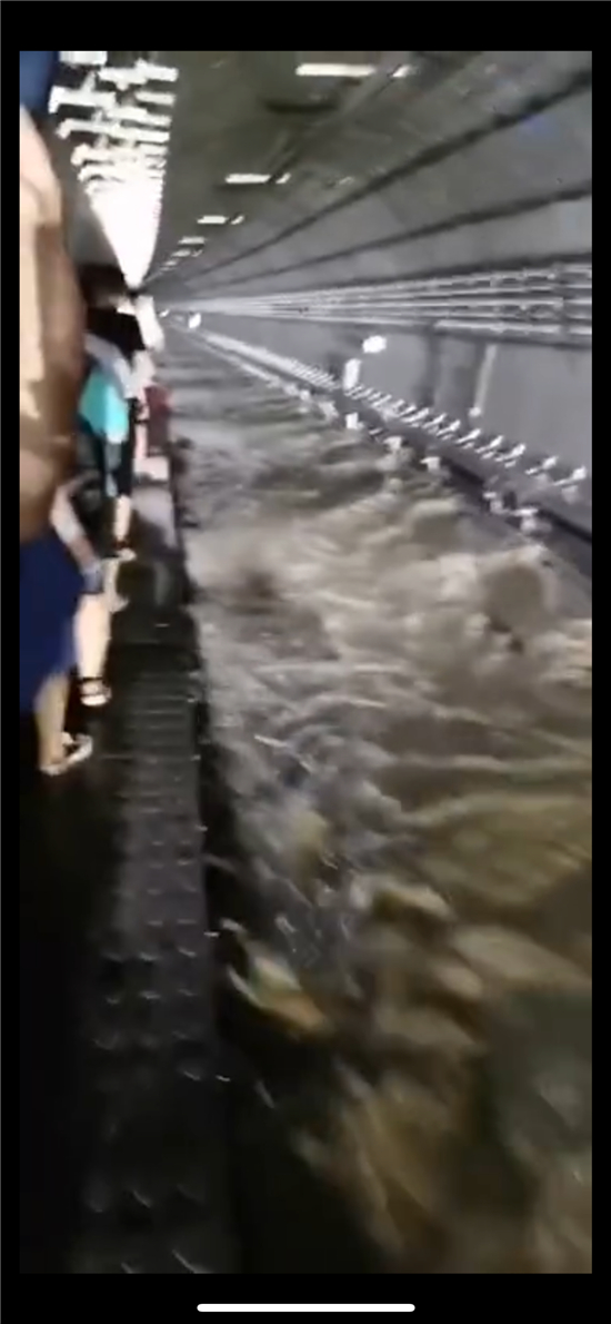 我也是那个时候才知道,地铁是有内部的人行通道的。当时大家听着列车长的指挥,抓住栏杆,沿着地铁轨道继续向外走。当时应该已经距离沙口路站很近了,我感觉可能就两百米多一点的样子。走在最前面的那一小部分人已经到了相对安全的位置,但是后面来的水很急很猛,而地铁下面的那个人行通道非常窄,人多且挤,大家根本就过不去,大部分的人走到一半就只能被迫回到车厢里。列车长也将车门关闭并不断地联系地面,等待救援。