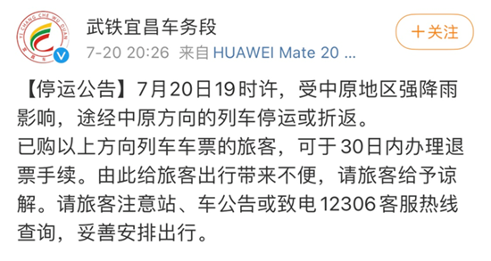 河南境内暴雨的影响还在持续。因郑州是京广(武广)高铁重要节点站,受暴雨影响,目前宜昌途经中原方向列车已全面停运。