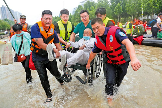 图:7月22日,河南郑州的救援人员协助坐在轮椅上的病患撤离受灾医院。\路透社