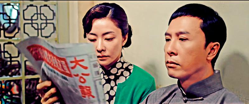 图:电影《叶问3》中,叶问(甄子丹饰)手持《大公报》,看到张天志要挑战自己的新闻,为免夫人(熊黛林饰)担忧,故意给她读副刊上的笑料。