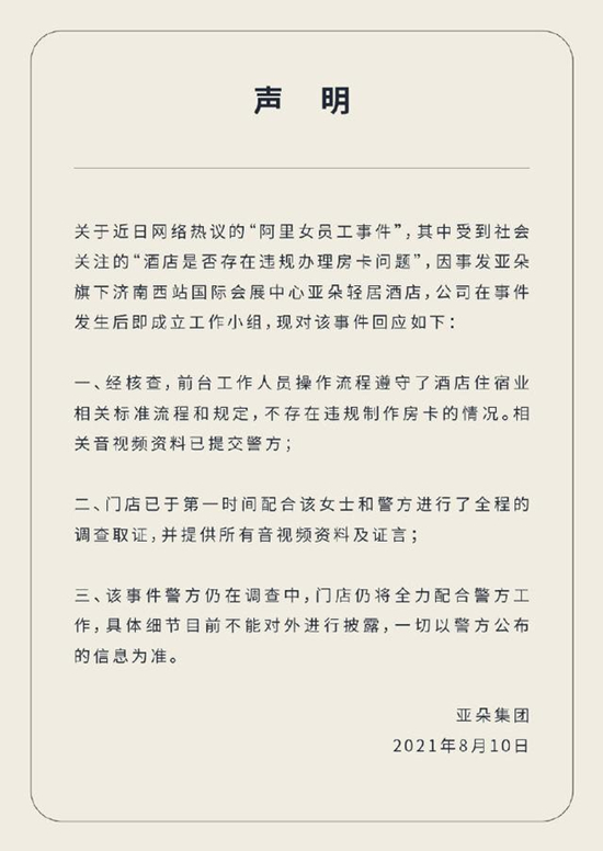 关于近日网络热议的“阿里女员工事件”,其中受到社会关注的“酒店是否存在违规办理房卡问题”,因事发亚朵旗下济南西站国际会展中心亚朵轻居酒店,公司在事发后即成立工作小组,现对该事件回应如下。