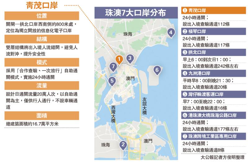 据珠海边检总站介绍,青茂口岸东距拱北口岸约800米,通过连廊与城轨珠海站接驳;粤澳双方联检楼采用联体无缝对接设计,共建设合作快捷查验通道100条、传统人工查验通道12条。口岸设计日通关量20万人次,将有效分流邻近的拱北口岸高峰客流,缓解其通关压力。