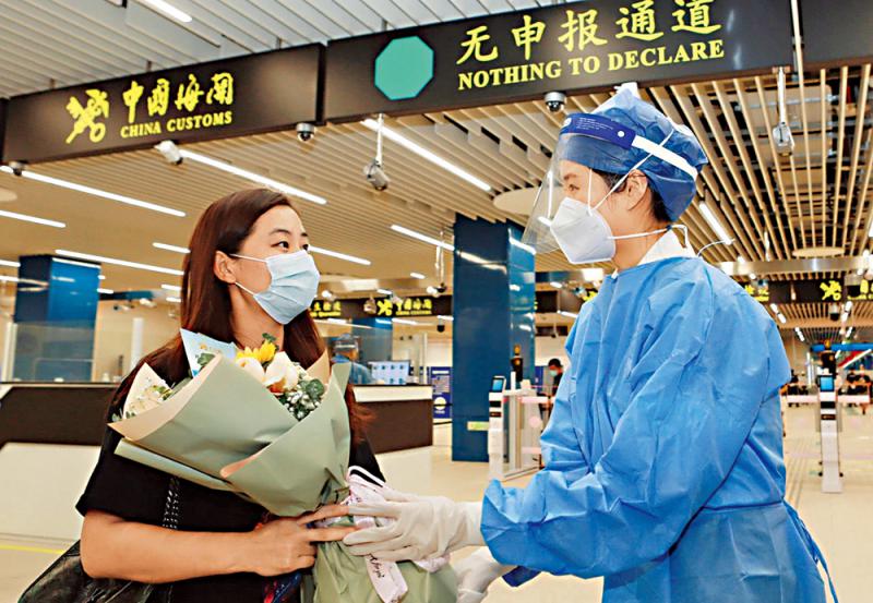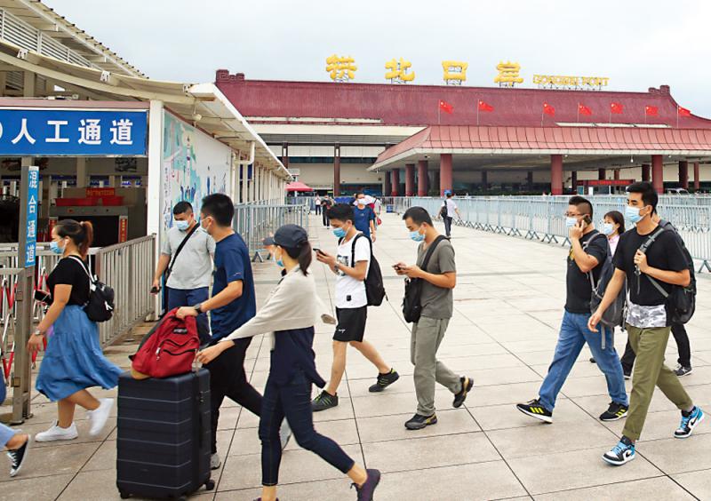 图:青茂口岸建设合作快捷查验通道100条。图为入境旅客在青茂口岸使用合作查验快捷通道通关。\中新社